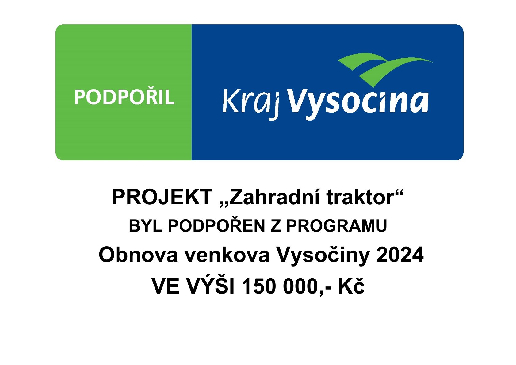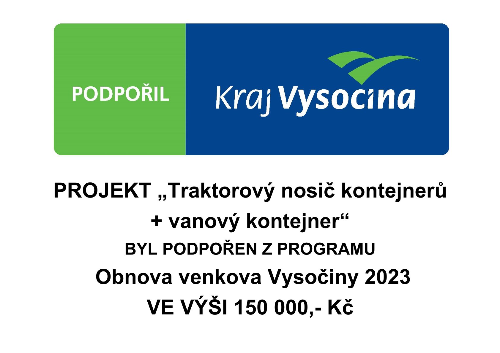 Publicita projektu z POV 2023 - Traktorový nosič kontejnerů + vanový kontejner Výdaje projektu: 309 760,- Kč Dotace z POV: 150 000,- Kč